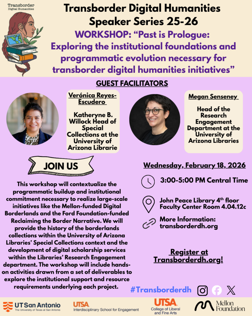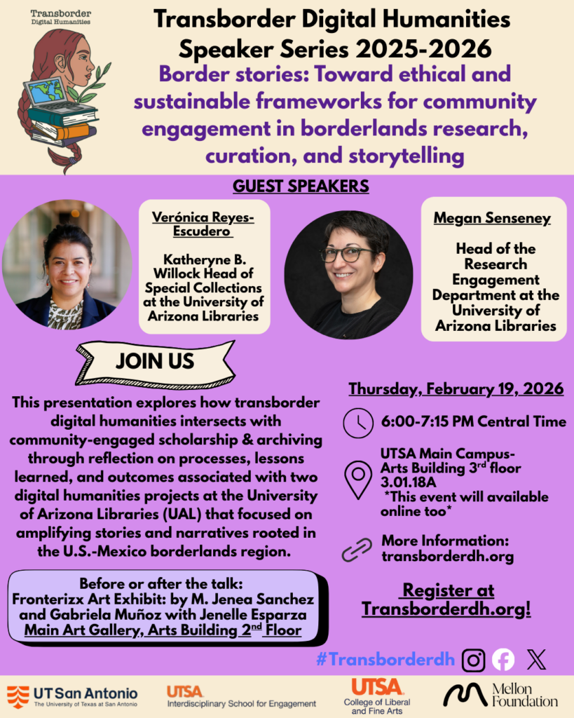 This presentation examines how transborder digital humanities intersects with community-engaged scholarship and archiving by reflecting on the processes, lessons learned, and outcomes of two digital humanities projects at the University of Arizona Libraries (UAL) focused on amplifying stories and narratives rooted in the U.S.–Mexico borderlands; it will be presented alongside Fronterizx: Art by M. Jenea Sanchez and Gabriela Muñoz with Jenelle Esparza at the UTSA Main Art Gallery, which foregrounds twenty-first-century, shared, and socially engaged art practices.